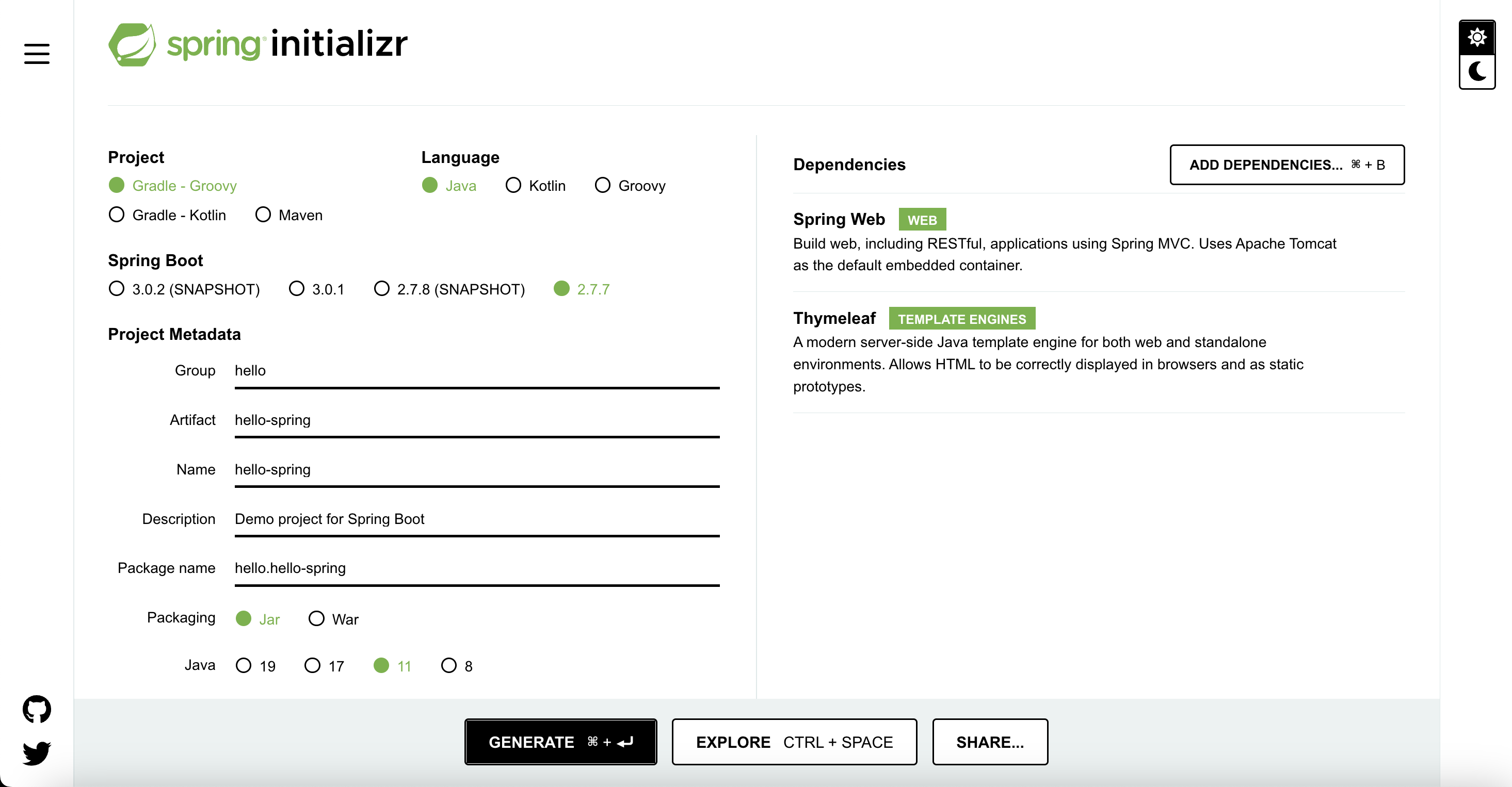 Dependencies - ์นํ๋ก์ ํธ๋ฅผ ์์ฑํด์ผ ํ๋ฏ๋ก Spring Web ์ ํ / HTML์ ๋ง๋ค์ด์ฃผ๋ ํ