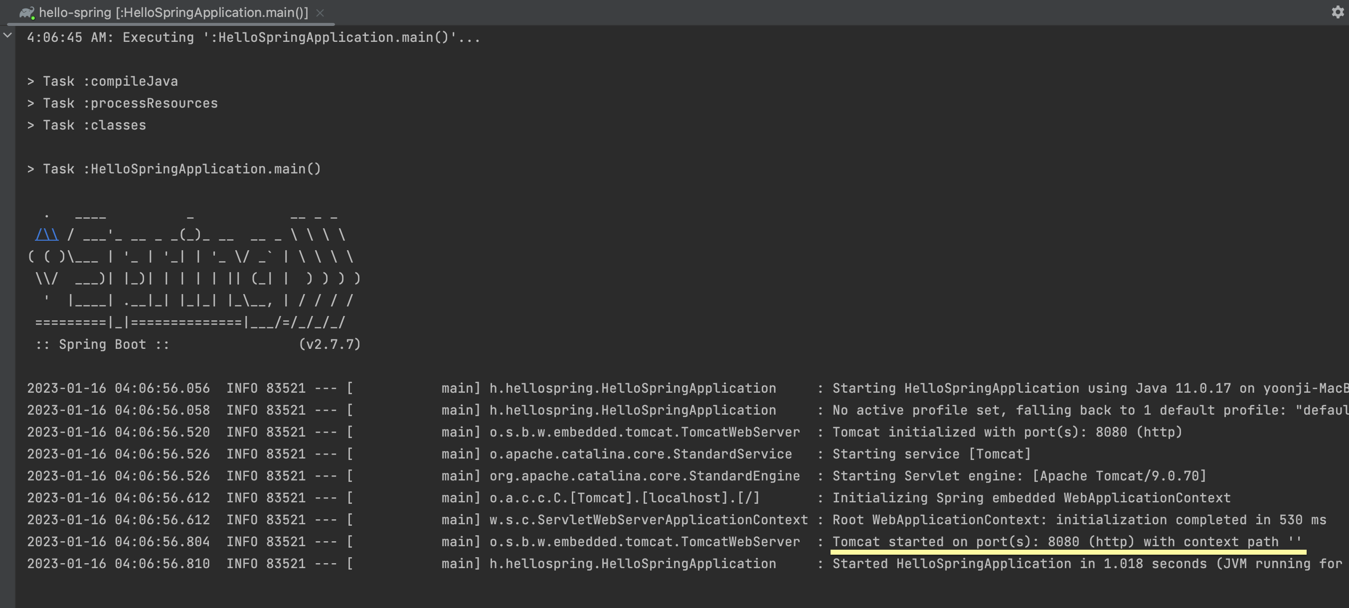 > HelloSpringApplication์ ์คํ์ํค๋ฉด IntelliJ ํฐ๋ฏธ๋์ ์์ ๊ฐ์ ํ๋ฉด์ด ๋ฌ๋ค.
