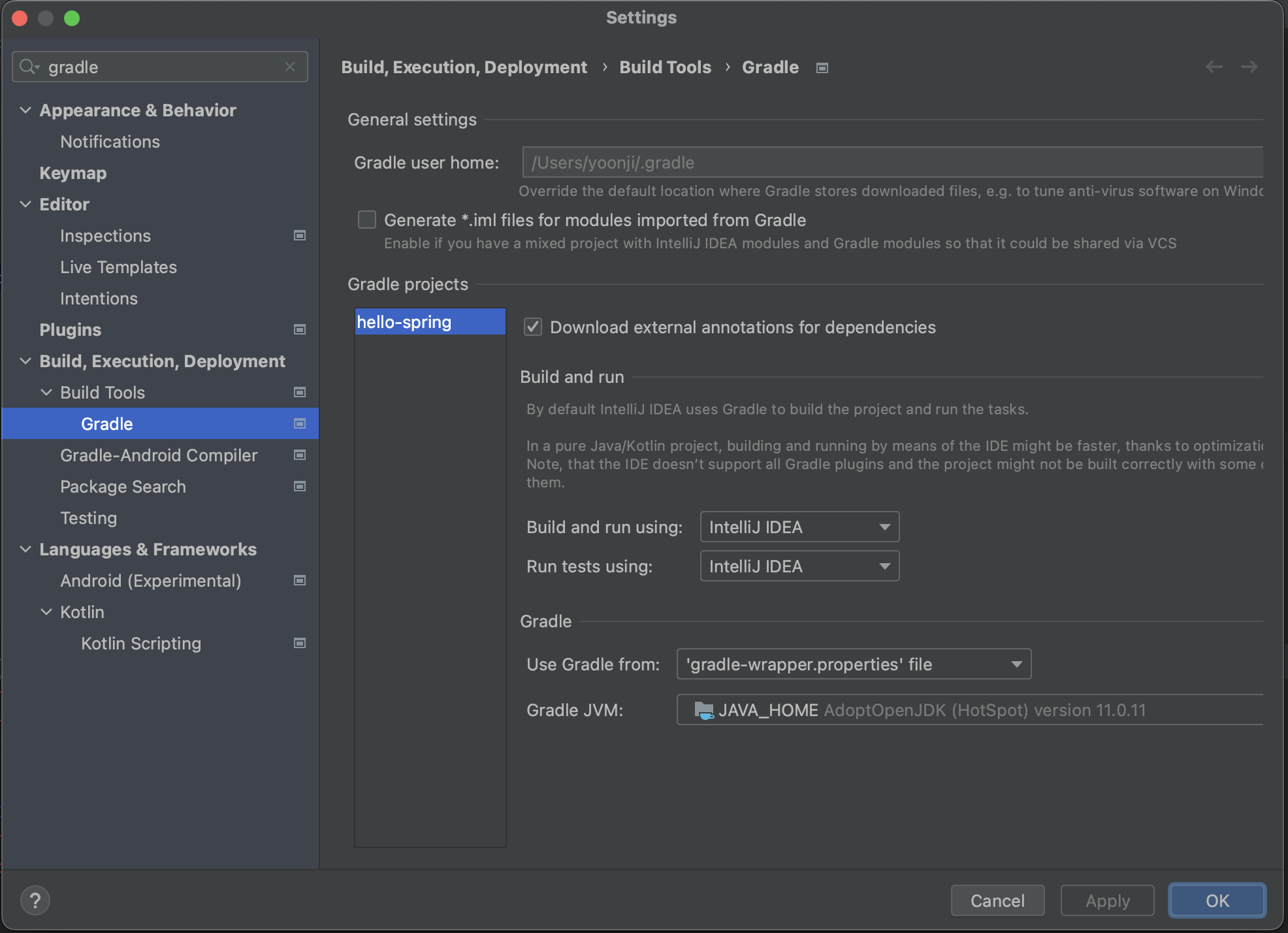 > Build and run using๊ณผ Run tests using ์ค์ ์ Gradle์์ IntelliJ IDEA๋ก ๋ฐ๊ฟ์ฃผ๋ฉด